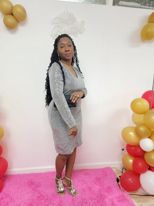 Longsleeve V Neck Silver Shimmer Dress