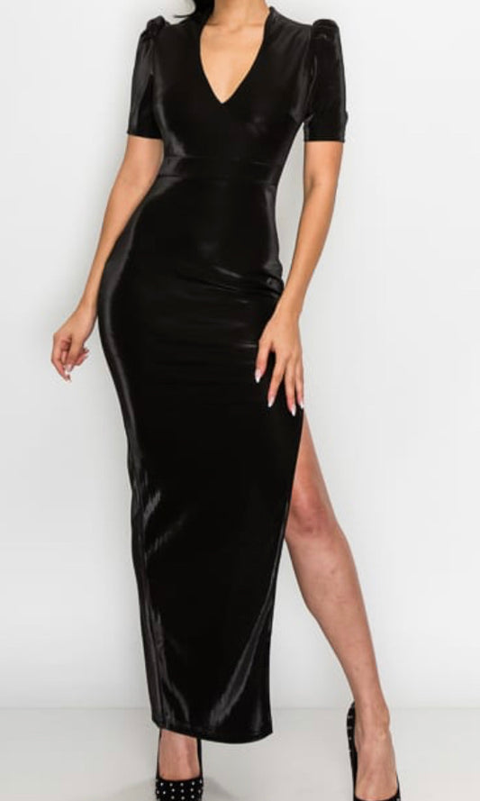 Velvet Puff Shoulder Side Slit Maxi Dress