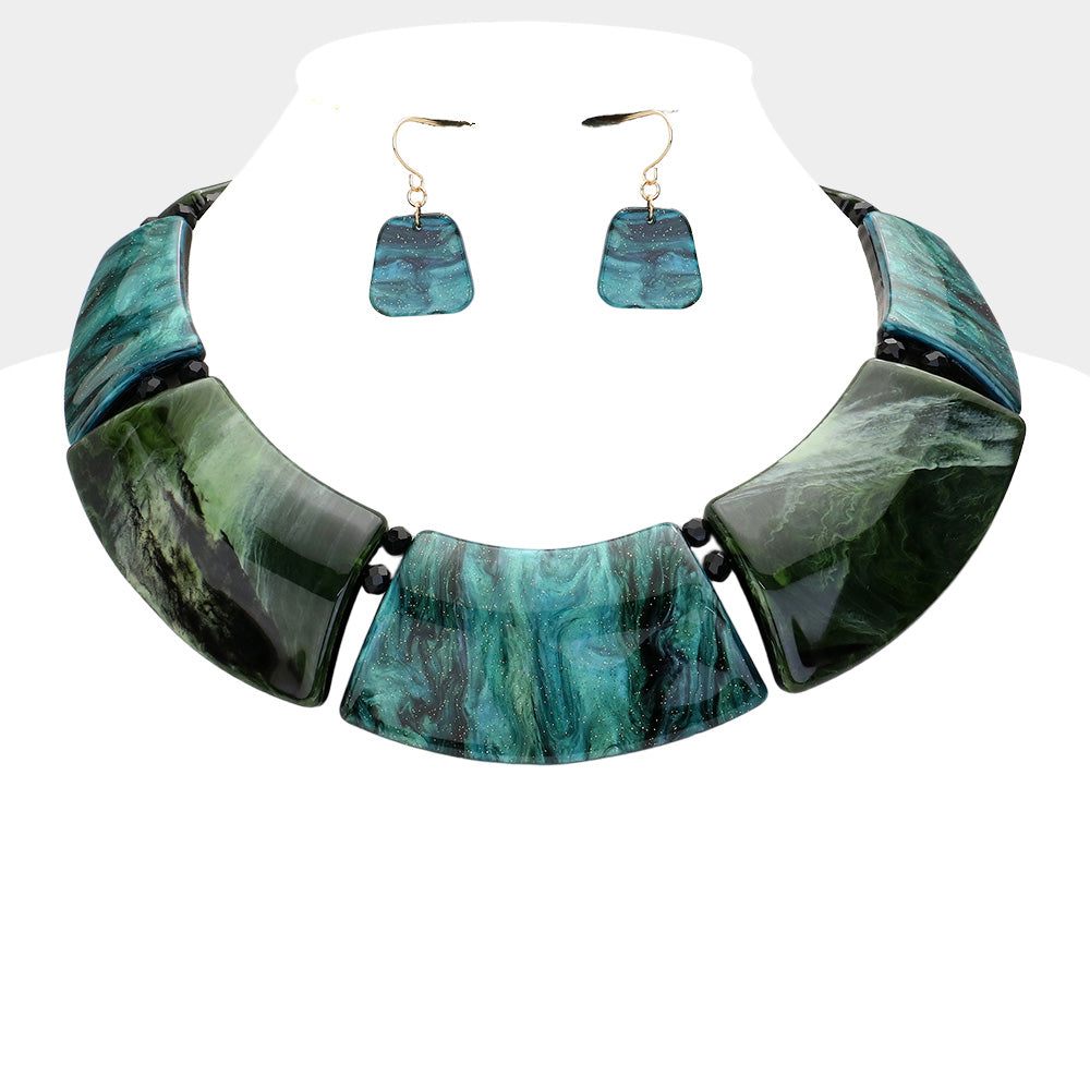 This Marble Print Resin Curved Bib Necklace Set is the perfect accessory to elevate any outfit with its unique and trendy design.